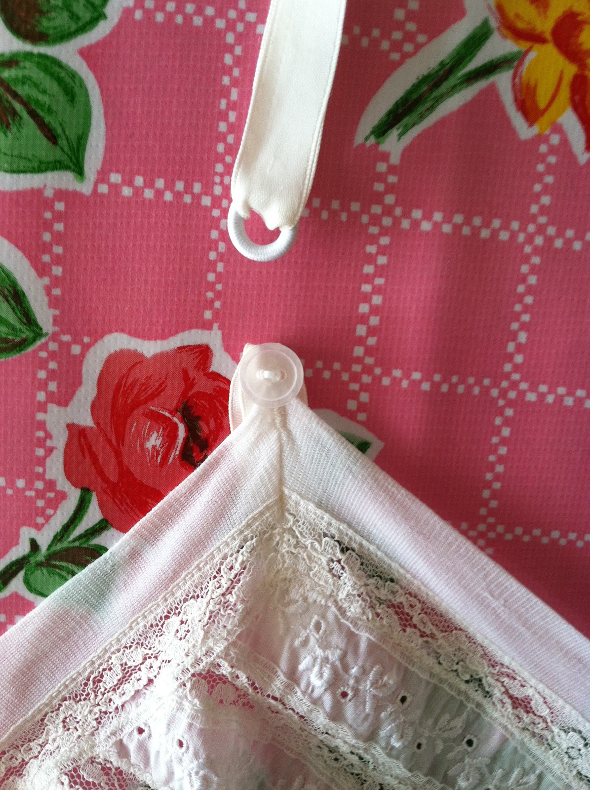 I had a vintage nightie I had bought at a yard sale and realized that the 1950’s cut is very flattering for larger busts. You can adapt it to any nightie with straps. I noticed that this one has the adjusting sliders on the front whereas many nighties have them in the back, or none at all – just plain straps. But you can still use this system and either have a fixed height (with the simple strappy ones) or adjust them in the back.